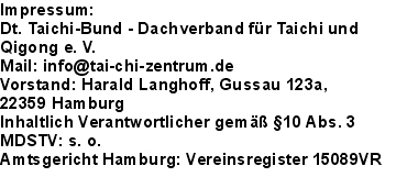 © 2013 All Rights Reserved. Dt. Taichi-Bund - Dachverband für Taijiquan & Qigong. Tel 040 2102123, Mail: Fajin-Info Dozenten/ Fachkräfte, Lernhilfen/Tutorials/ Methodologie Qigong Taiji Quan Ausbildung mit Fajin-Zertifizierung für Taiji-Quan Qigong Verbände